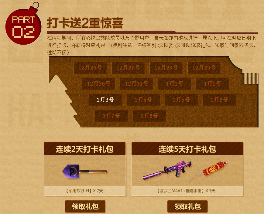 在活动期间,所有心悦cf战队成员以及心悦用户,当天在CF内游戏进行一局以上即可在对应日期上 进行打卡,并获得对应礼包。(特别注意:连续签到2天以及5天可以领取礼包,领取时间仅限当天,过期不候)