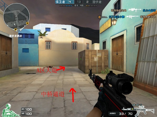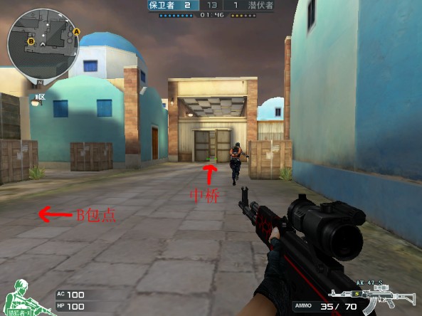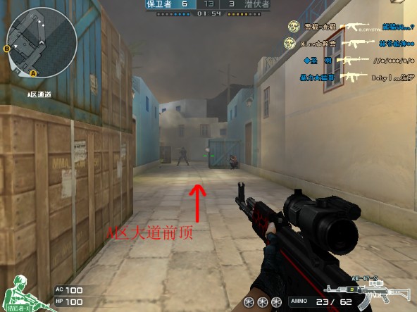 2. 以攻代防,这是保卫者能否在前期占据优势的关键。一般情况下可分为两组(每组4人并配一名狙击手):一组在狙击手的掩护下直冲A区大道(图5),前顶压制敌人,并视具体情况决定是否突破防线,直冲潜伏一方复活点。
