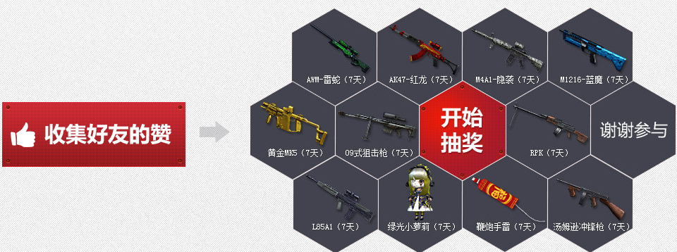 2.2014年1月14日后首次注册用户可领取新手礼包和1次“赞”,积累赞可在下面兑换礼包;每日向好友要1个赞可获得1次抽奖机会,如果邀请的1个好友来到页面领取了新手礼包,你可以成功获得1个赞,赞数可累加,并可通过消耗相应的赞数去兑换对应的道具;