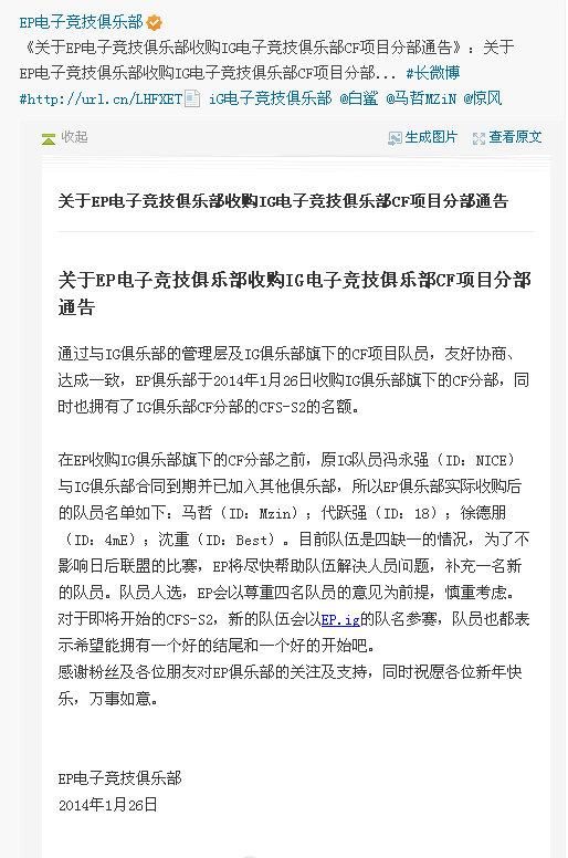 关于EP电子竞技俱乐部收购IG电子竞技俱乐部CF项目分部通告