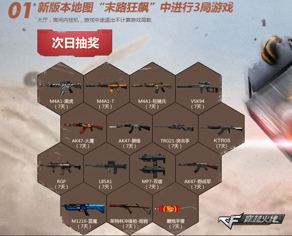 日前,CF全新地图“末路狂飙”随贺岁版本上线,趣味竞速射击吸引了众多CFer的目光。1月16日-2月7日,CF推出“兄弟相聚、沙漠狂飙”活动(http://cf.qq.com/act/a20140116desert/)助力新模式体验,玩家在“末路狂飙”中完成3局游戏,次日可抽取CF为玩家们准备的珍稀枪械。在活动页面邀请好友回归火线战场,还有机会成为火线领袖获赠特权礼包,受邀CFer也可领取回归大礼。多样迷彩神兵、近身利器马来剑、投掷武器鞭炮手雷应有尽有,CFer相聚酣享火线对战。