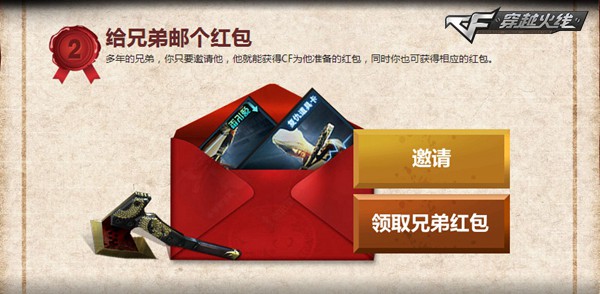 CF不仅为玩家们准备了好礼,还为曾和玩家一起征战火线的伙伴们备齐了红包。CFer最后一次游戏时间在2013年12月21日(不包括当天)以前的好友,每成功邀请其中3名回到游戏一起来战,双方均将获得相应的火线大红包。AK-47火麒麟、AWM-天龙、、军用手斧-翔龙等神兵利器让玩家们战力十足。