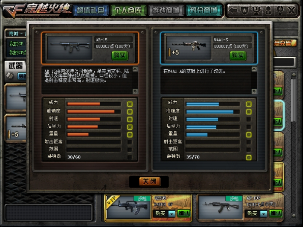 我用了常用的m4-s来做比较,可以看出,威力,重量与准确度是一样的。但是ar15拥有更高的射速,高射速的代价便是不稳定的大后坐力。有一点需要注意的是,作为cf点的道具,却标配了30发子弹,在高射速的情况下,子弹会很不够用的。