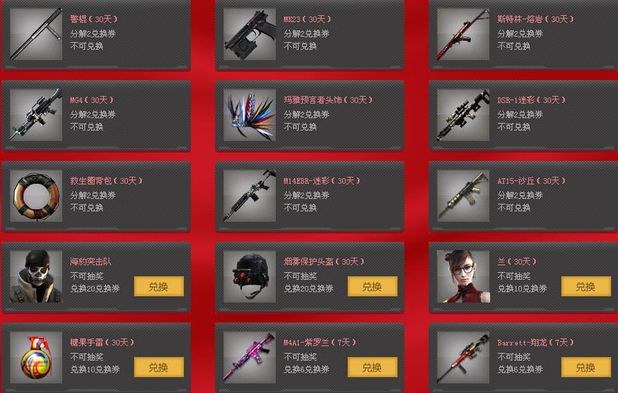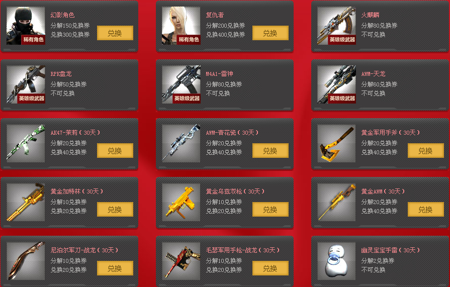 6、不同级别道具可分解的兑换券数量不同,集齐一定数量兑换券后可直接兑换稀有道具。