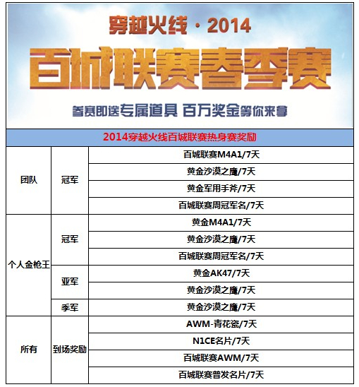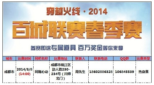 全国最具人气的穿越火线赛事品牌——“百城联赛”春季赛即将拉开帷幕,本周热身赛开启。CF百城风暴再次席卷神州大地。这里是草根玩家的舞台,这里是草根大神的天堂,这里更是众多CFer欢聚的盛宴。缤纷道具等你来拿,参与就用道具相送!