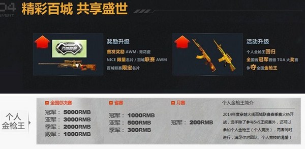 除了主题活动外派发道具奖励回馈玩家外,本次2014百城春季赛的赛事奖励也有升级。选手只需参赛就可获得AWM-青花瓷加NICE限定名片和百城AWM加百城联赛限定名片中的一种。此外,阔别已久的全国个人金枪王争霸赛也将重新开启,与正赛同样的晋级方式——省赛冠军晋级争夺全国金枪王,最后的胜者将获得5000人名币的奖励。