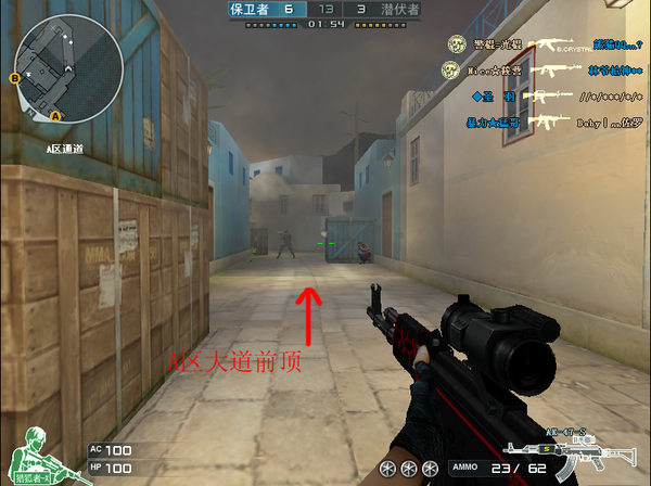 2. 以攻代防,这是保卫者能否在前期占据优势的关键。一般情况下可分为两组(每组4人并配一名狙击手):一组在狙击手的掩护下直冲A区大道(图5),前顶压制敌人,并视具体情况决定是否突破防线,直冲潜伏一方复活点。