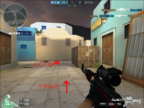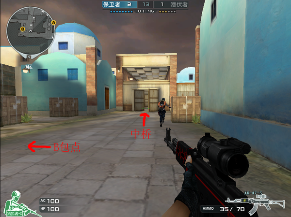 2. 行动前确定打A区。首先潜伏一方要派2名狙击手在A大道占据中桥,对B区防守人员进行火力压制。剩下的6人分成两组,每组3人,一组从A区大道与对方A区防守者正面交火,另一组从水下****A区斜坡(图3),同时要注意防止中桥斜坡的敌人打背身。