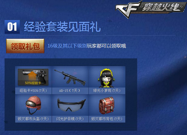 对于CF的新手玩家们来说,经验套装是必不可少的。50%经验卡、AR-15、绿光小萝莉、毁灭都市背包等增加经验的道具一应俱全,只要玩家等级在16级以下即可轻松领取,欢乐升级之旅就此开启。
