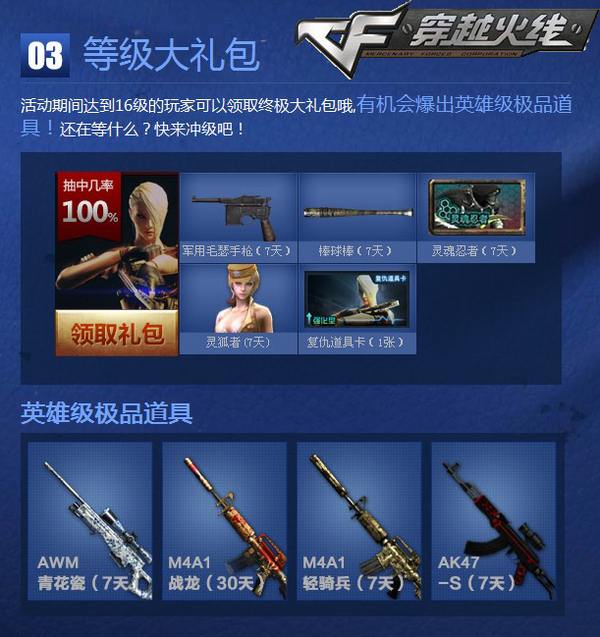 随着新手玩家们的升级,新手冲级计划更是准备了等级大礼包,不仅有AK103、M249MINI、M4A1-隐袭等诸多经典武器,还有诸如:AWM-青花瓷、M4A1-战龙等不可多得的英雄级武器,让玩家们的战斗之旅更加得心应手。