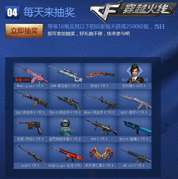 除了经验套装礼包、升级礼包外,新手玩家们每日游戏,还可以每天领取高达2500的经验,并且参与抽奖活动,众多经典武器送不停,让玩家们的战斗在众多道具武器的助力下,更加紧张刺激充满乐趣。