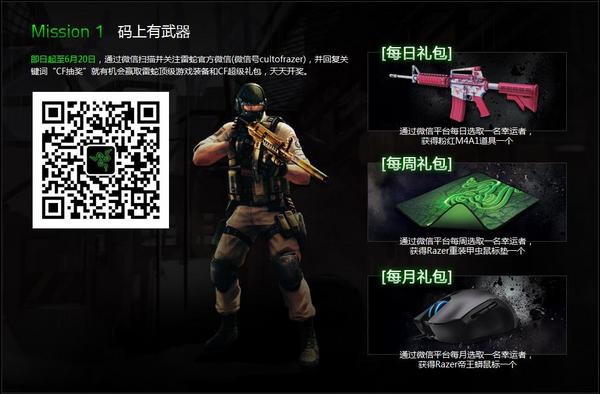 即日起至6月20日,通过微信扫描并关注【雷蛇玩家殿堂】(微信号:cultofrazer),并回复关键词“CF抽奖”(请准确输入,发送后以收到系统答复为准,请勿重复参与)就有机会赢取雷蛇顶级游戏装备和CF粉红M4A1七天使用权,天天开奖,每天一小奖,每周一大奖,更有月度大奖——Razer帝王蟒游戏鼠标等着你!该活动每周会推送一次中奖名单,敬请关注。日奖获奖者将得到一串激活码,可前往CF官网的CDKEY兑换页面领取武器。
