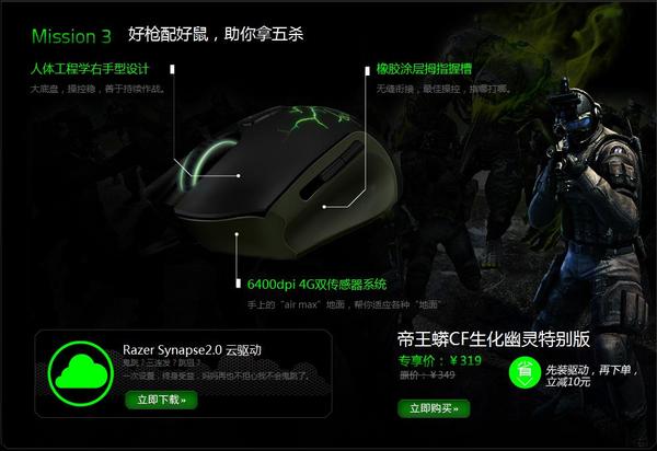 即日起通过手机在Razer官方天猫旗舰店购买帝王蟒CF生化幽灵特别版,先装驱动,再下单,不仅能获得80元手机端购买优惠,还能再获得10元优惠。详情请访问Razer天猫旗舰店:http://razer.tmall.com/。