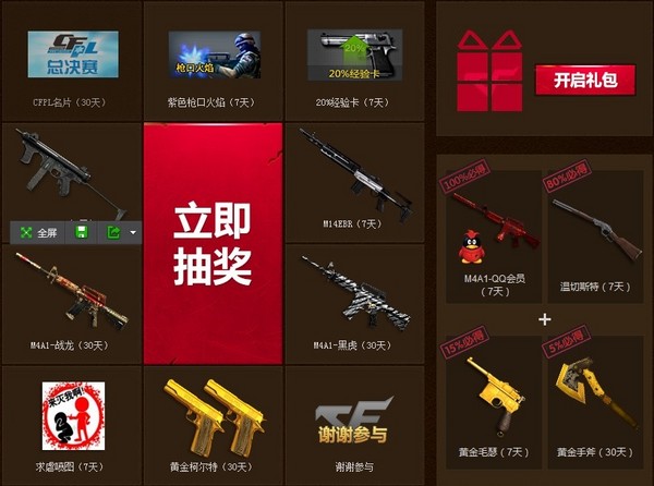 活动期间,完成以上任务可获得相应抽奖机会,本页面开通1个月超级会员,即可获得1个月会员服务以及100%获得M4A1-QQ会员-7天,还能随机获得3个道具中的其中1个!