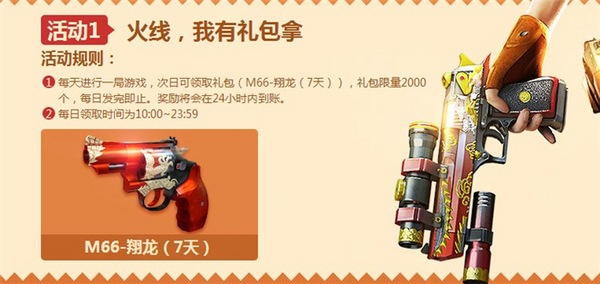玩家成功关注CF官方微信号后,活动期间,每天只需要进行一局游戏,次日便可通过CF官方微信号轻松领取M66-翔龙(7天),助玩家轻松杀敌,越战越强。