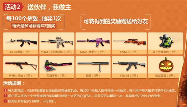 活动期间,玩家在游戏中每完成100个杀敌便可获得1次抽奖机会,每天最多可获得3次,完美放大玩家的对战乐趣;AK47-黑锋、M4A1-紫罗兰、玫瑰手斧、AWM-R、**等道具正待玩家前来抽取。本次活动奖励与以往略有不同,玩家可将自己所抽取到的游戏奖励赠送给同一大区的QQ好友,我的奖励我做主。