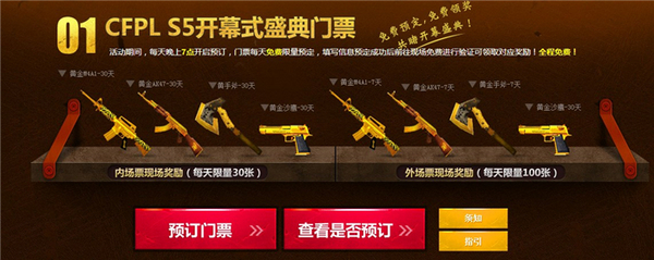 CFPL在历经4个赛季之后越趋成熟,逐渐树立起了一根国内FPS游戏竞技标杆。随着万众期待的S5的到来,电子竞技行业势必将被推上一个新的高度。第五季开幕式已定于4月26日在上海游戏风云电竞馆举行,本次开幕式门票将分为内场和外场两个种类,所对应的道具奖励也自然不同;领取到内场票的玩家可获得30天黄金道具,而拿到外场票的玩家可轻松的将7天黄金道具奖励收入囊中。本次门票全部免费放送,所有CFer前往活动页面都有机会领取;活动期间,每天晚上7点开启预订,门票每天免费限量预定,填写信息预定成功后前往现场免费进行验证可领取对应奖励!零门槛,全民皆有机会到场观看激情洋溢的开幕式盛典。