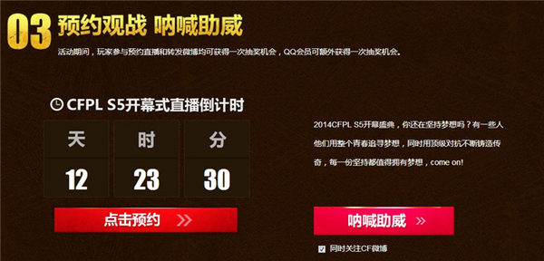 活动期间,玩家可点击预约按钮,一键设置将CFPLS5开幕式直播时间添加至QQ提醒中,让精彩不再错过。此外,玩家还可通过活动页面一键转发微博,为CFPL加油呐喊,为心中的战队助威。玩家参与预约直播和转发微博均可获得一次抽奖机会,QQ会员可额外获得一次抽奖机会。也许不是每一位玩家都能成功登上CFPL大舞台去完成自己的冠军梦,但依然能通过为自己喜爱的战队呐喊助威的方式,去追随自己的电竞梦想。