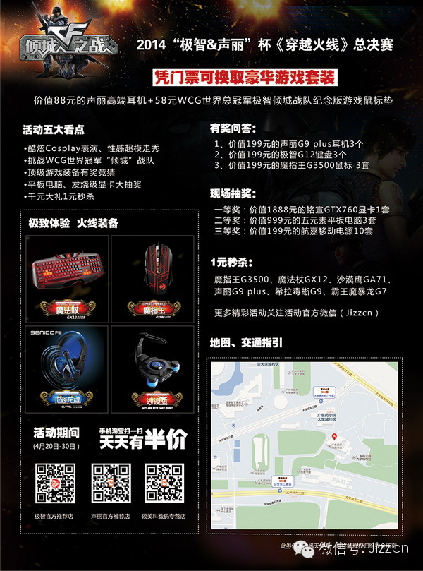 除了冠军争夺赛,主办方还会在现场给大家带来精彩的Cosplay、街舞表演、性感超模走秀。到场的观众还可凭门票还可换取146元的豪华大礼包。不喜欢?没关系,现场还有平板电脑、顶级游戏显卡等万元大奖等你来拿,更有1元秒杀活动赢取各种游戏外设。还可以在4.20—4.30之间,登陆官方推荐网店,天天有半价。