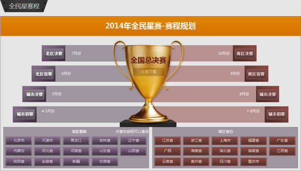 多达北方13个省份(北京、天津、黑龙江、吉林、辽宁、内蒙、河北、河南、山东、山西、陕西、安徽、甘肃),134个地(市/区)级城市,CF全民星赛以地市初赛、城市决赛、省份决赛、大区决赛层层递进的模式进行选拔,其完整的赛事体系和丰富的赛事奖励旨在为更多CFer实现电竞梦想提供机会!