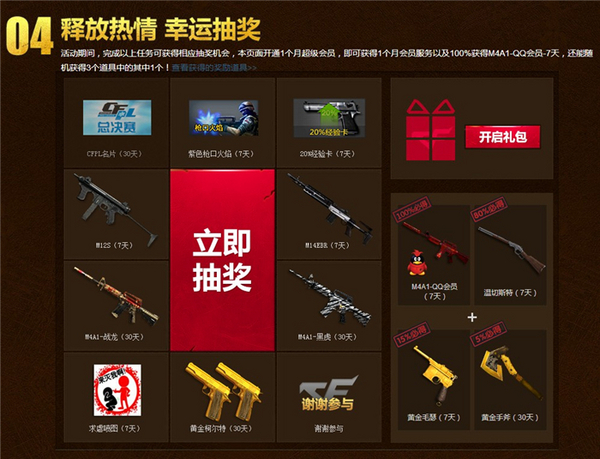 本次活动,将开放抽奖环节,点燃CFer激情。玩家通过完成活动任务,获得抽奖机会,则可在活动页面抽取各类道具,CFPL名片、M4A1-战龙、M4A1-黑虎等正待玩家前来“认领”。此外,玩家在活动页面开通1个月超级会员,即可获得1个月会员服务以及100%获得M4A1-QQ会员-7天,还能随机获得1个道具,同样的价格,更丰厚的内容,给力服务为玩家“私人订制”。