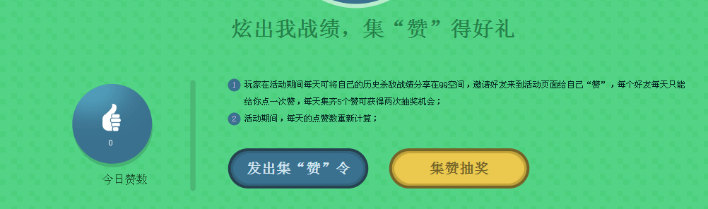 1玩家在活动期间每天可将自己的历史杀敌战绩分享在QQ空间,邀请好友来到活动页面给自己“赞”,每个好友每天只能给你点一次赞,每天集齐5个赞可获得两次抽奖机会;