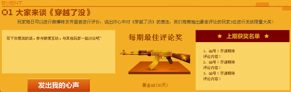 玩家每日可以进行微博转发并留言进行评价,说出你心中对《穿越了没》的想法,我们每期抽出最佳评论的玩家3位进行发放限量大奖!