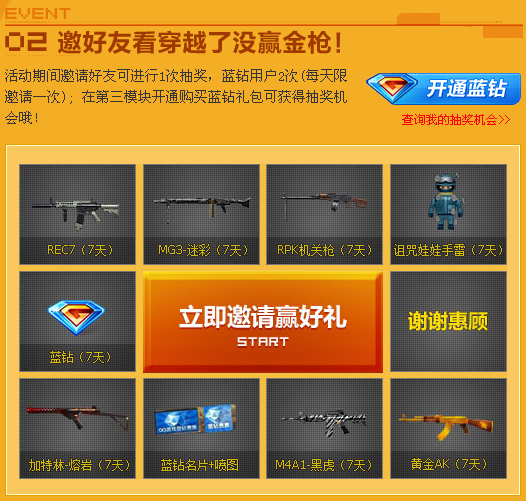 活动期间邀请好友可进行1次抽奖,蓝钻用户2次(每天限邀请一次); 在第三模块开通购买蓝钻礼包可获得抽奖机会哦!