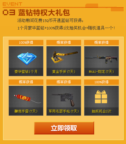 活动期间花费15Q币开通蓝钻可获得:1个月豪华蓝钻+100%获得2次抽奖机会+随机道具一个!