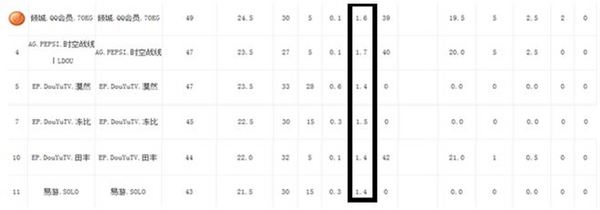 击杀比榜单由来自AG.PEPSI.时空战线的绿豆、倾城.QQ会员.的70kg、EP.DouYuTV的冻B、漠然、田丰、易游电竞的SOLO领跑。从榜单来看击杀比较高的几乎都是狙击手,而EP.DouYuTV在此份榜单中独占三元。