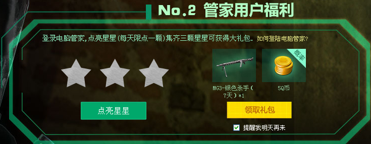 登录电脑管家,点亮星星(每天限点一颗)集齐三颗星星可获得大礼包.