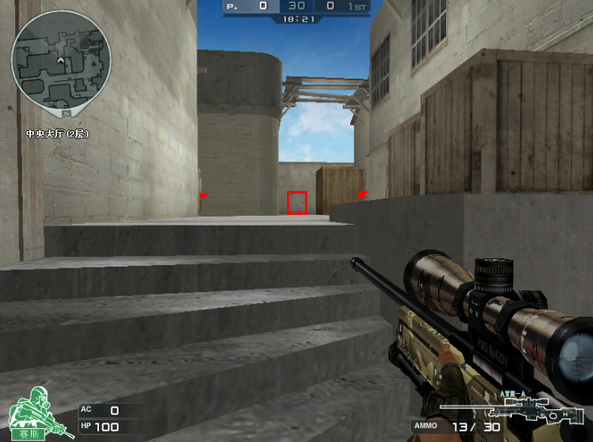 4、 上来右侧的楼梯上也会看到一个复活点,左右两侧。如图1一样,上来楼梯跟图1的打法简直一模一样了,但是这个点位的打法不像图1一样主动去寻找敌人,既然这个点位有楼梯那么肯定就有它的用处,你可以利用这个楼梯进行闪蹲观察复活点位、左右两侧出现的敌人。当然,你在观察楼梯上面的同时不要忘记楼梯下面还有两个点位需要你留意,所以你还是灵活运用这个楼梯进行楼上楼下的观察。