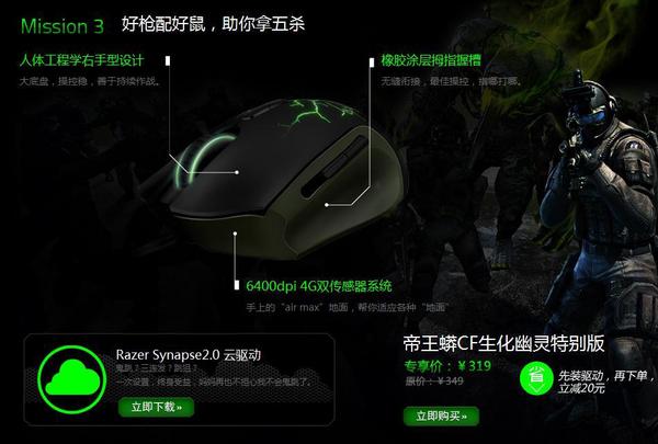 即日起通过手机在Razer官方天猫旗舰店购买帝王蟒CF生化幽灵特别版,先装驱动,再下单,不仅能获得80元手机端购买优惠,还能再获得20元优惠。详情请访问Razer天猫旗舰店:http://razer.tmall.com/ 。