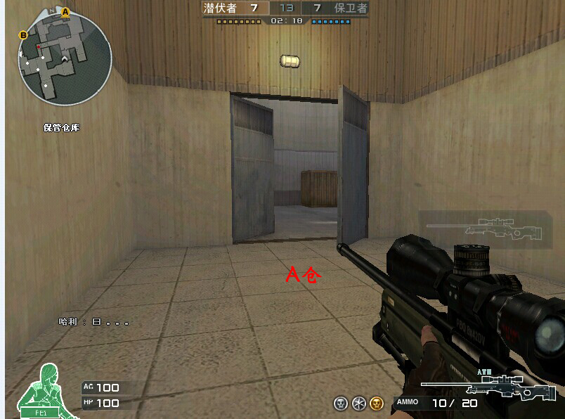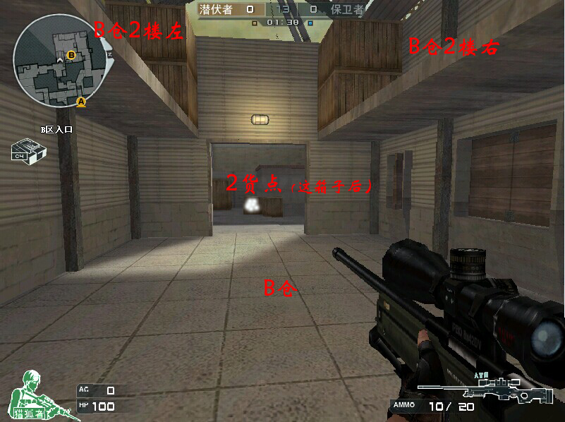 中路连接的对面就是B仓了,这里是进攻B的直接路径,B仓2楼一个,下面一个的走位攻打B时比较有利,同时也防止保卫的前压。图中说到的2货点其实是一个非常尴尬的点,这个点经常被穿,而且起身探点也容易被秒,假如对方不搜这点的话,这个点还是可以偷到很多背身的,所以小咖叫他2货点了。