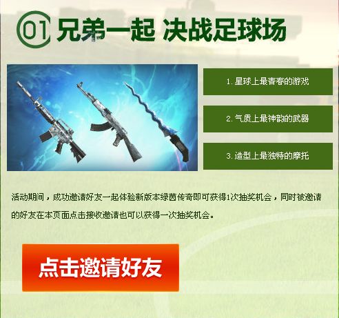 活动期间,成功邀请好友一起体验新版本绿茵传奇即可获得1次抽奖机会,同时被邀请的好友在本页面点击接收邀请也可以获得一次抽奖机会。