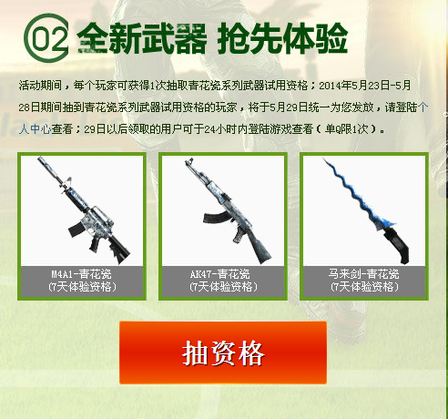 活动期间,每个玩家可获得1次抽取青花瓷系列武器试用资格;2014年5月23日-5月28日期间抽到青花瓷系列武器试用资格的玩家,将于5月29日统一为您发放,请登陆个人中心查看;29日以后领取的用户可于24小时内登陆游戏查看(单Q限1次)。