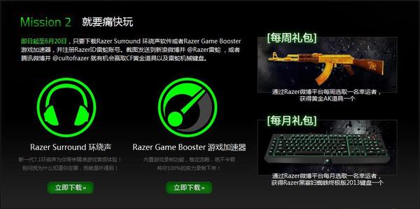 即日起至6月20日,只要下载“Razer Surround 环绕声软件”或者“Razer Game Booster游戏加速器”,并注册RazerID雷蛇账号。截图(需含自己的RazerID和软件界面)发送到腾讯微博并 @cultofrazer 就有机会赢取CF黄金AK七天使用权(周奖)以及雷蛇机械键盘(月奖)。该活动每月公布一次获奖名单,也将通过推送方式公布。