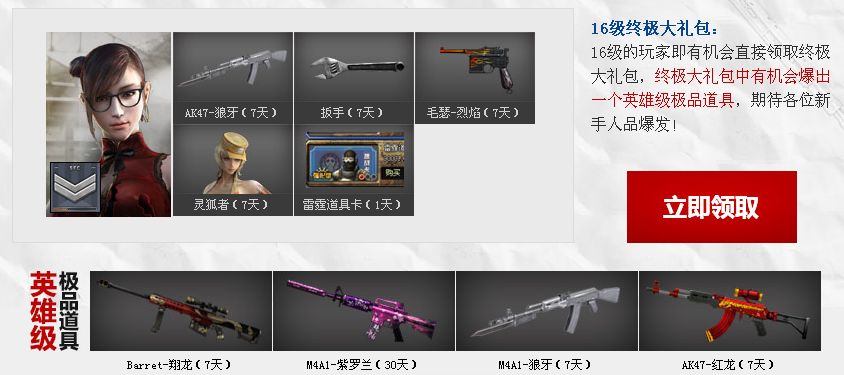 16级终极大礼包:16级的玩家即有机会直接领取终极大礼包,终极大礼包中有机会爆出一个英雄级极品道具,期待各位新手人品爆发!