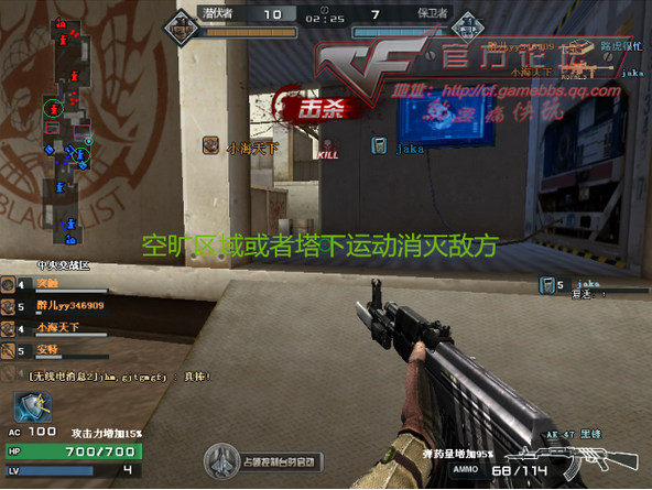 (1)如果是近战比较占优势的枪械,类似打击者或者AA-12.气锤之类的散弹枪,就在左右两小道上偷人或者正面火拼,**这个图,前期收取对方玩家人头能很快的提升经验(新图杀死对方玩家明显比冰封要塞得到的经验多很多),利用雷达和掩体拐角处,在敌人出现一瞬间给敌人以重大打击,掌握好时间,猝不及防下给予重创,然后打残血就非常容易了,然后带走对方之后,看自己血量,如果比较高,就敢于前冲,对拼,血量不足时,猥琐塔下回血,当然前提是敌方玩家都还没有技能,这个时候可以猥琐塔下回血,如果敌方玩家有技能,就不要在塔下一定范围内活动,敌方有技能的玩家通常都会对敌方防御塔下重点关照。
