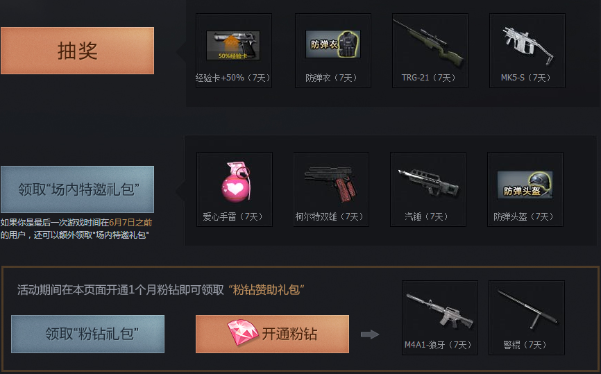 3.最后一次游戏时间在6月7日之前的用户可领取“场内特邀礼包”;