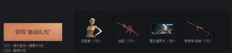活动期间用,每天游戏一局累计3天,可获得"奋战礼包"