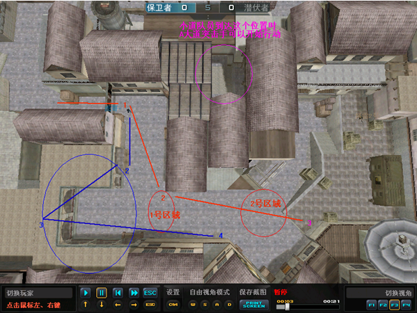 ⒉狙击手在突击手停止之后开始移动至蓝色2号位,并架枪排查A大道蓝色2号区域可隐蔽位置,并逐步进入蓝色3号区域(就是我们常说的WC)