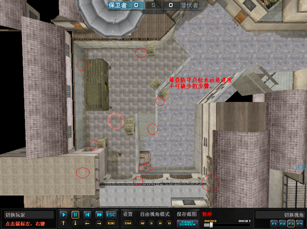 ③、黑色城镇卡点的位置较多,所以A区进攻时一定要注意做好防守点的排查,避免遭到伏击。容易出现的防守位置如下面图中的标示。