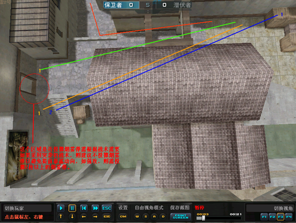 3、狙击手在3位队员到位之后开始移动至蓝色2号区域,并夹枪掩护,此时,副攻手利用反弹投掷闪光弹进入B房,突击手1号则利用反弹投掷闪光弹至B区内。这是狙击手可以冒头,并给予B窗口方向的敌方目标进行打击。