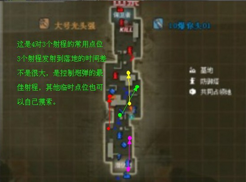 知道了这些,你需要做的就是练好投弹的准头,如果都不能将炮弹投到你想要的位置,那就算你的轻炮+10也没用。这个东西其实练习起来并不难,轻炮的射程有5个(按住鼠标左键调整射程),最远的射程可以打出“沙漠风暴”这张图的三分之一,可以从复活点打到自家第一防御塔的位置,但需要的发射时间和炮弹抛射时间很长,一般不建议用,比较合适的是3个射程,不仅可以保护自己不在第一时间被敌人杀掉,还能减少战场上的变性。
