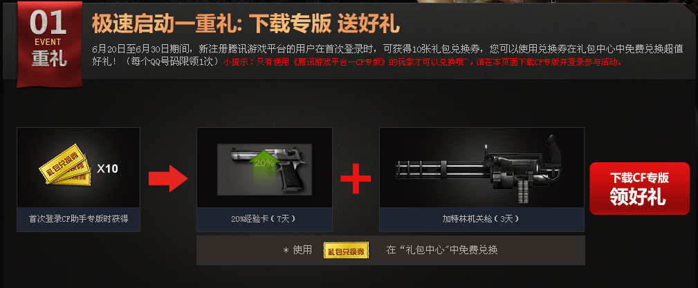 6月20日至6月30日期间,新注册腾讯游戏平台的用户在首次登录时,可获得10张礼包兑换券,您可以使用兑换券在礼包中心中免费兑换超值好礼!(每个QQ号码限领1次)小提示:只有使用《腾讯游戏平台--CF专版》的玩家才可以兑换哦~,请在本页面下载CF专版并登录参与活动。