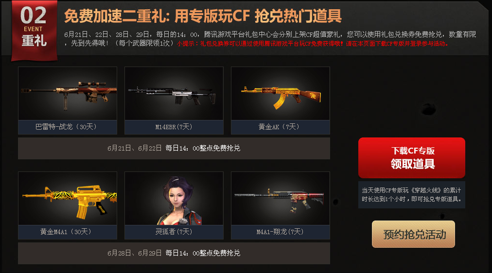 6月21日、22日、28日、29日,每日的14:00,腾讯游戏平台礼包中心会分别上架CF超值豪礼,您可以使用礼包兑换券免费抢兑,数量有限,先到先得哦!(每个武器限领1次)小提示:礼包兑换券可以通过使用腾讯游戏平台玩CF免费获得哦!请在本页面下载CF专版并登录参与活动。