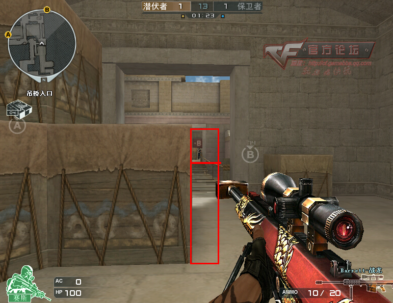 1、 与B区狙击手对狙的时候。双方的障碍物都只是一堆箱子,露出半边身子,或者蹲在箱子上面打。双方的打法基本一样,只有看双方的狙击手哪一边更冷静、熟练。有时双方在这里对狙的狙击手并不是只有一个,所以就要冷静判断怎么合理的利用旁边的障碍物进行掩护自己打掉对方狙击手,掩护队友进攻!