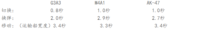 从速度上来说,G3A3有着相对不错的优势,在GP枪当中,2.0秒的换弹堪比玫瑰精灵(玫瑰精灵1.9秒)而切换也远远快于M4A1和AK-47。重量上略重于M4A1,和AK-47相当。