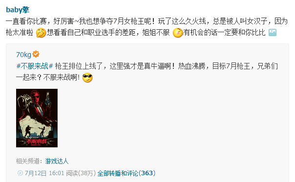 那究竟baby擎和70争夺枪王的事情发展如何,70kg在看到微博回复之后会不会出来迎战,我们17173穿越火线专区也会继续跟进报道,尽请期待!